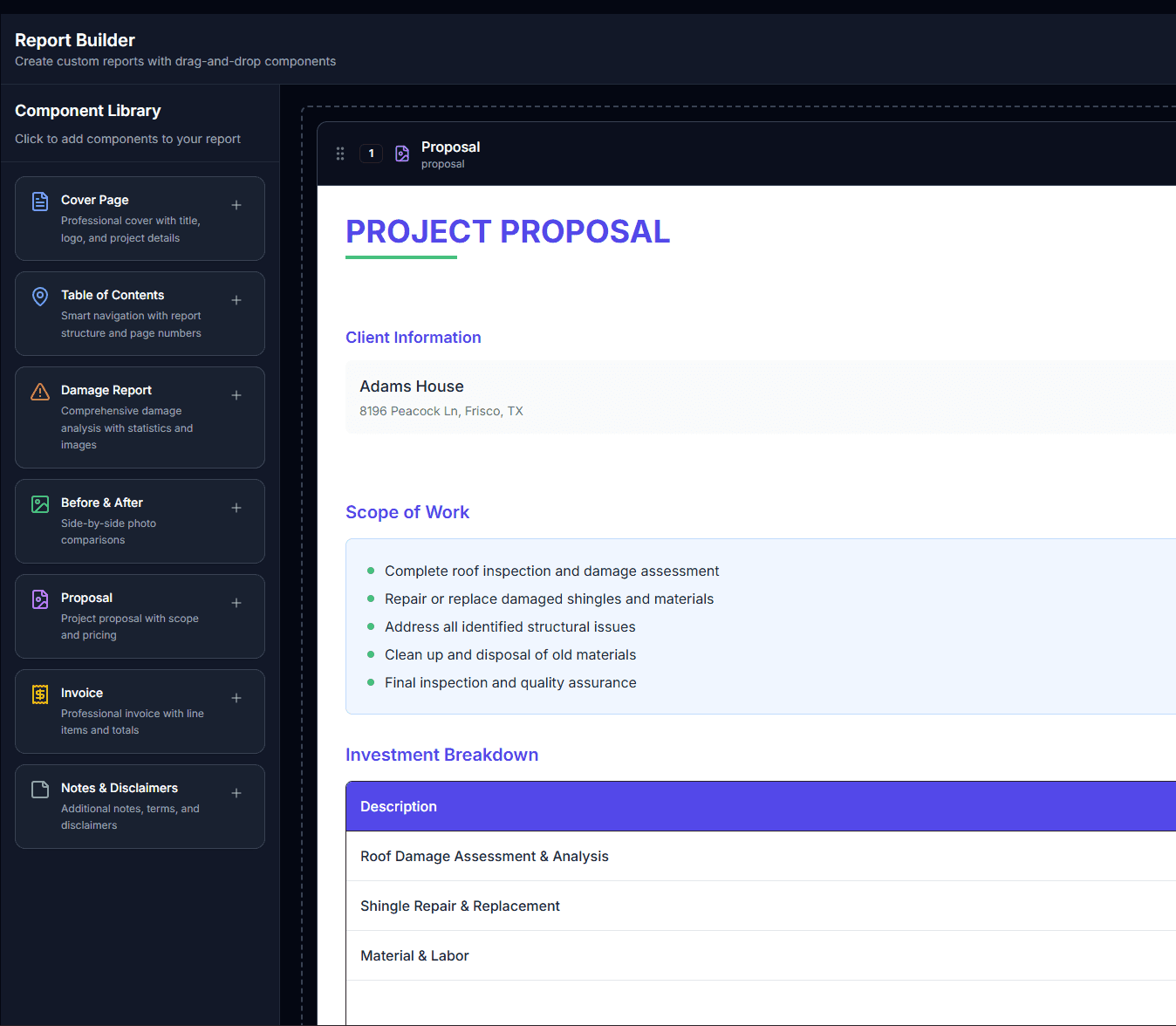 Custom Reports in Seconds With Templates Drag and drop components like damages, measurements, proposals, and more to make client-ready reports tailored to each.