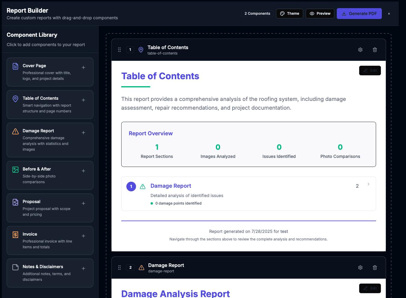 We've also launched a comprehensive report builder that streamlines the creation and customization of professional documents. Users can now easily rearrange and edit invoices, proposals, and damage reports within a unified interface, significantly reducing the time from assessment to deliverable.